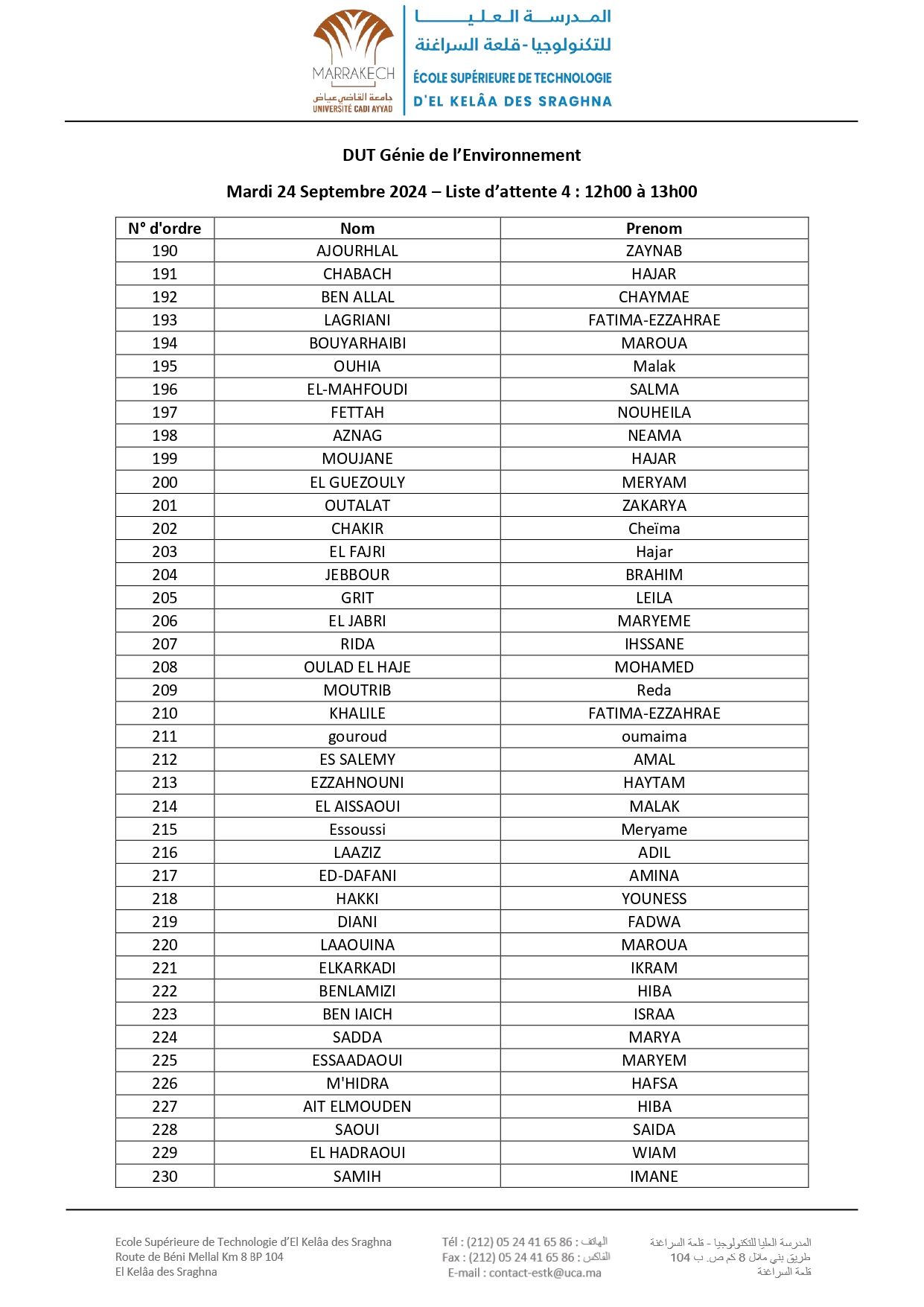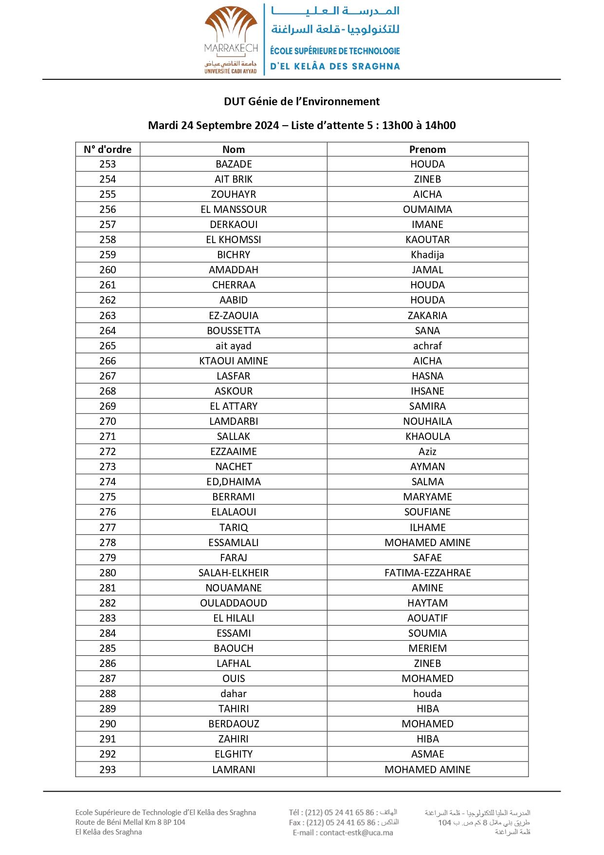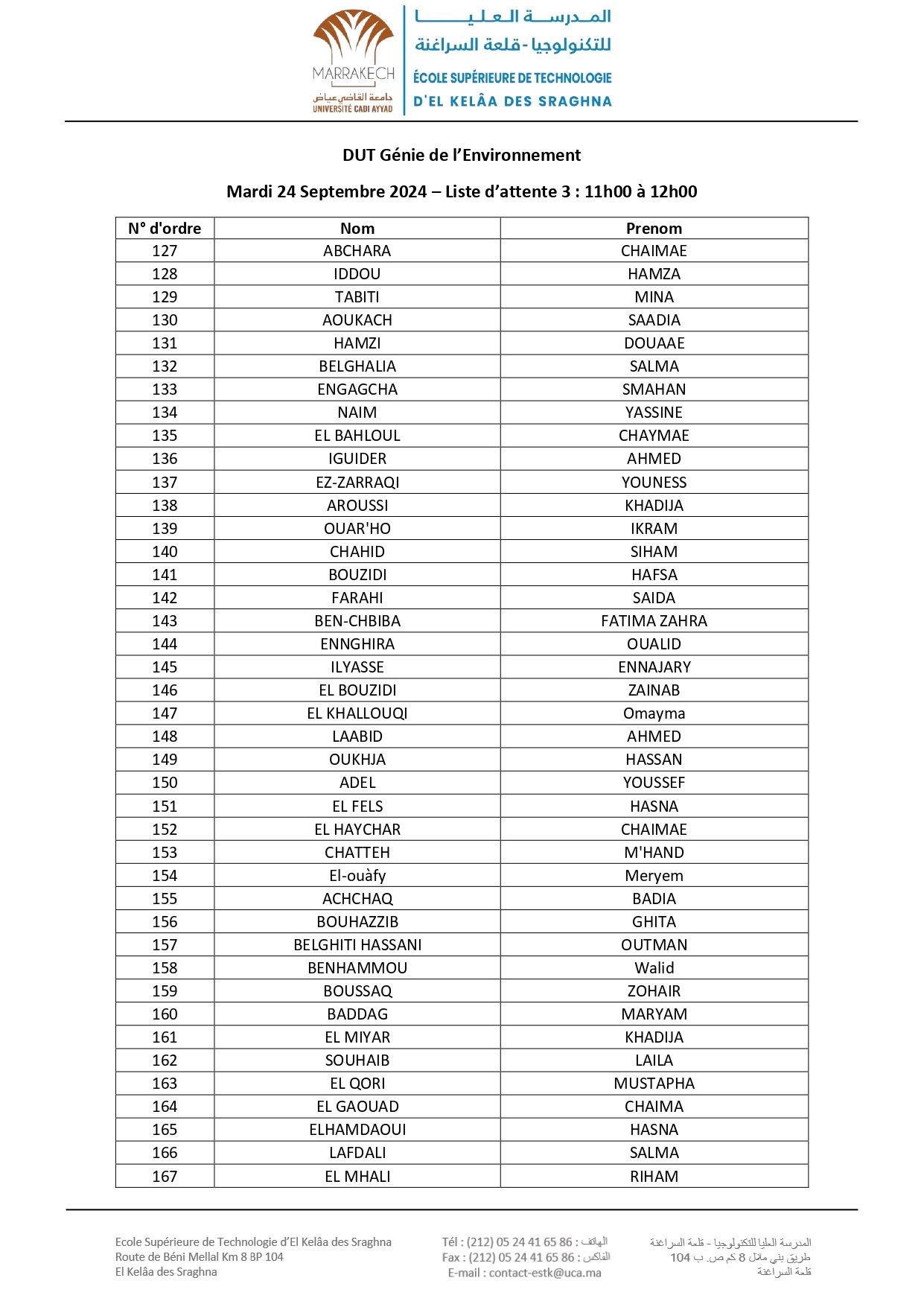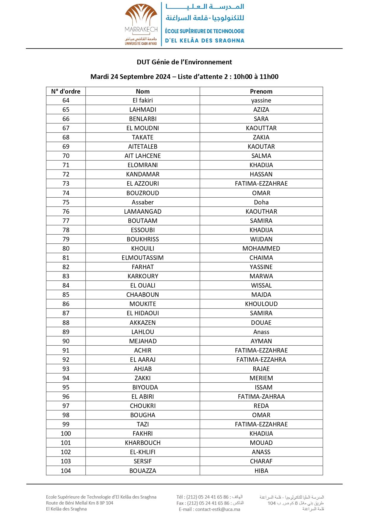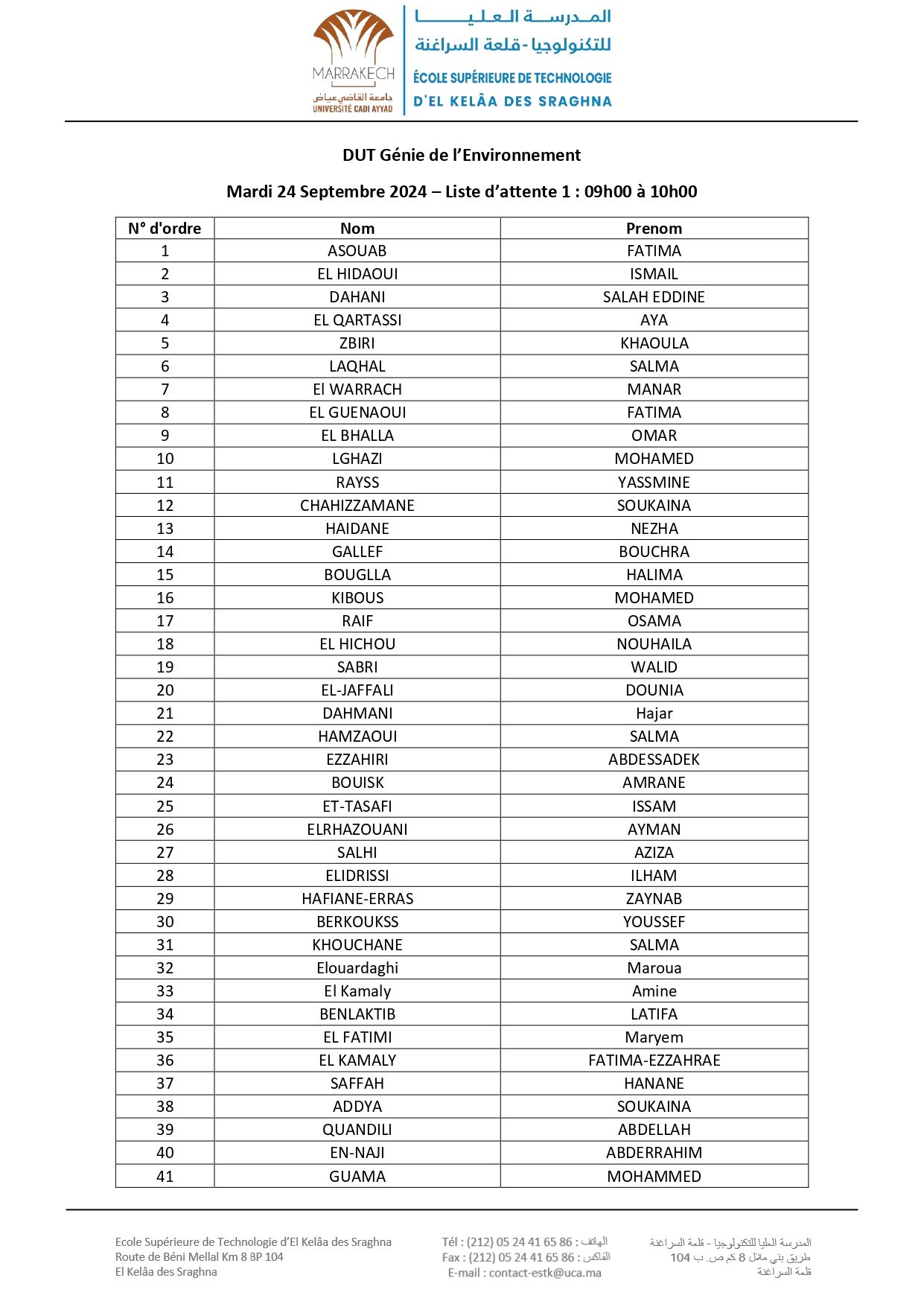 Avis aux nouveaux étudiants admis à s'inscrire en 1 ère DUT à l’EST d’El Kelâa des Sraghna (ESTK) – Listes d’attente : Filière Génie de L'environnement23 Sept 2024