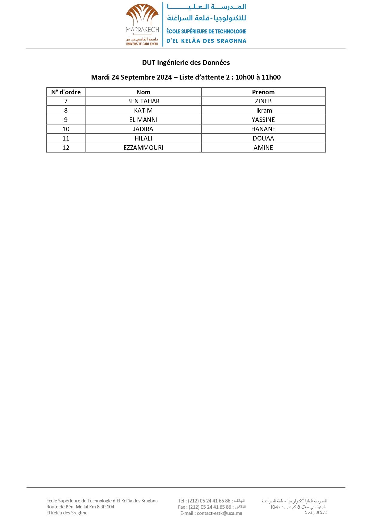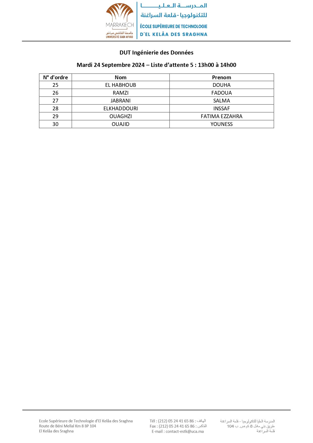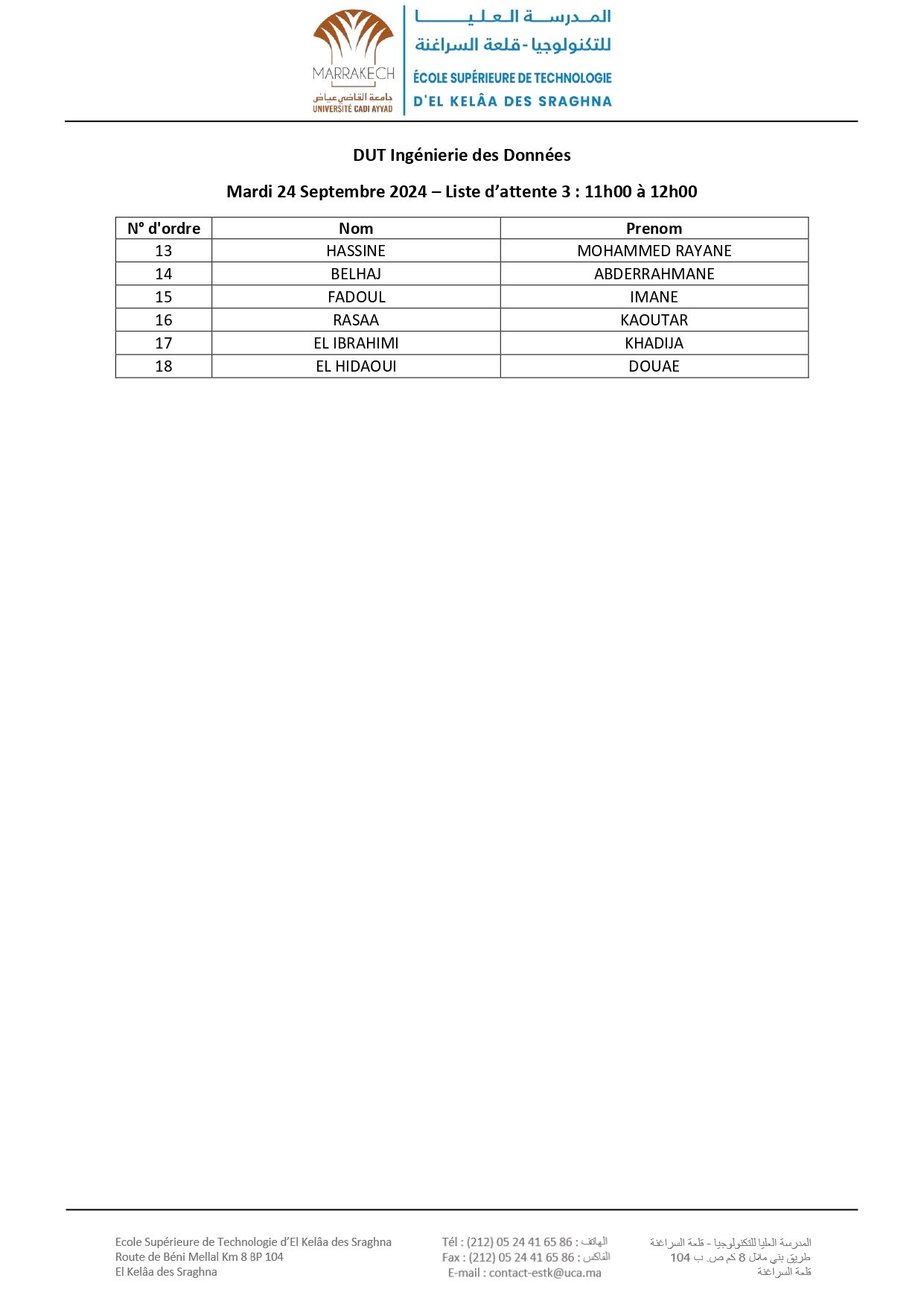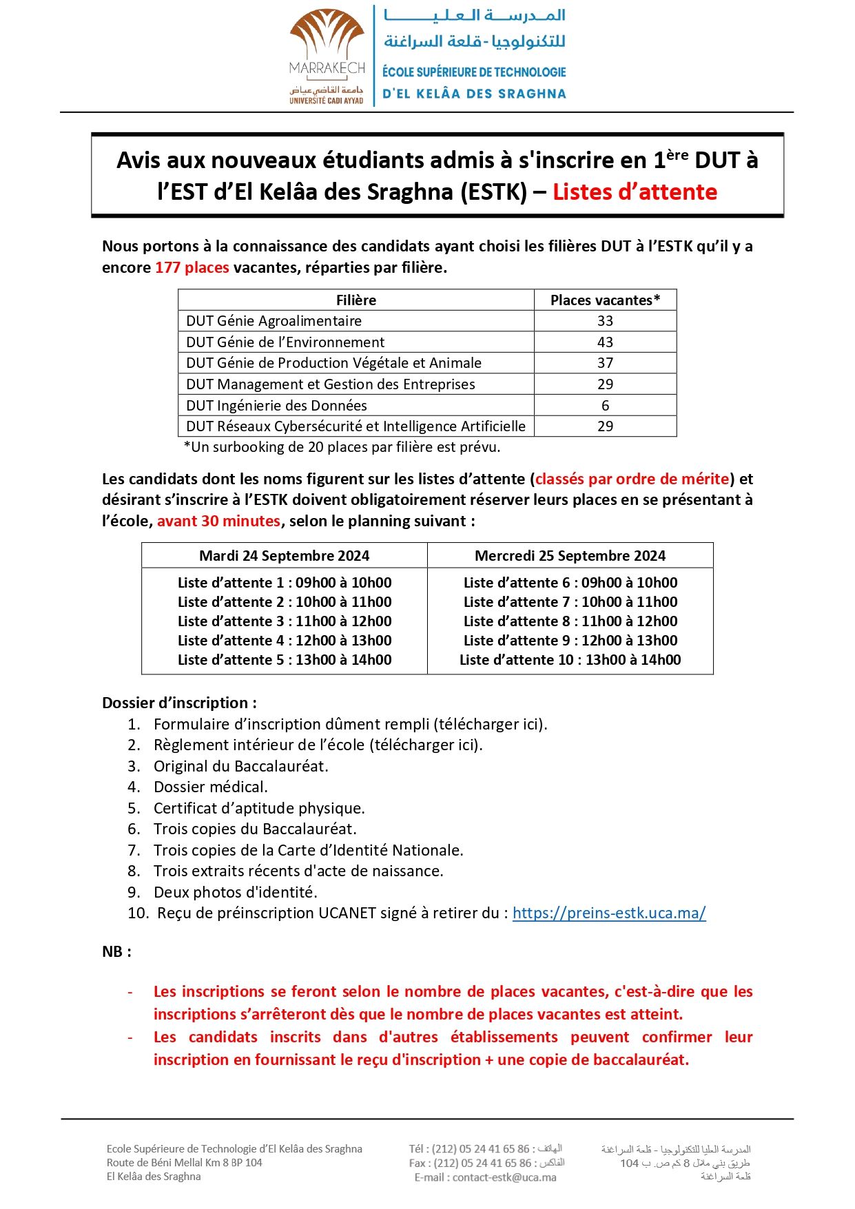 Avis aux nouveaux étudiants admis à s'inscrire en 1 ère DUT à l’EST d’El Kelâa des Sraghna (ESTK) – Listes d’attente : Filière Ingénierie des Données23 Sept 2024