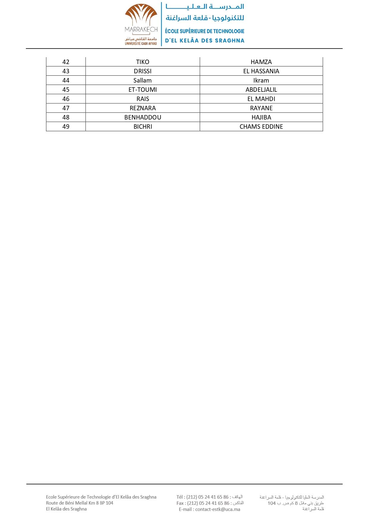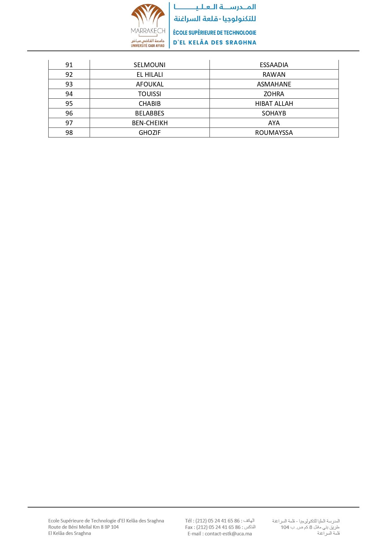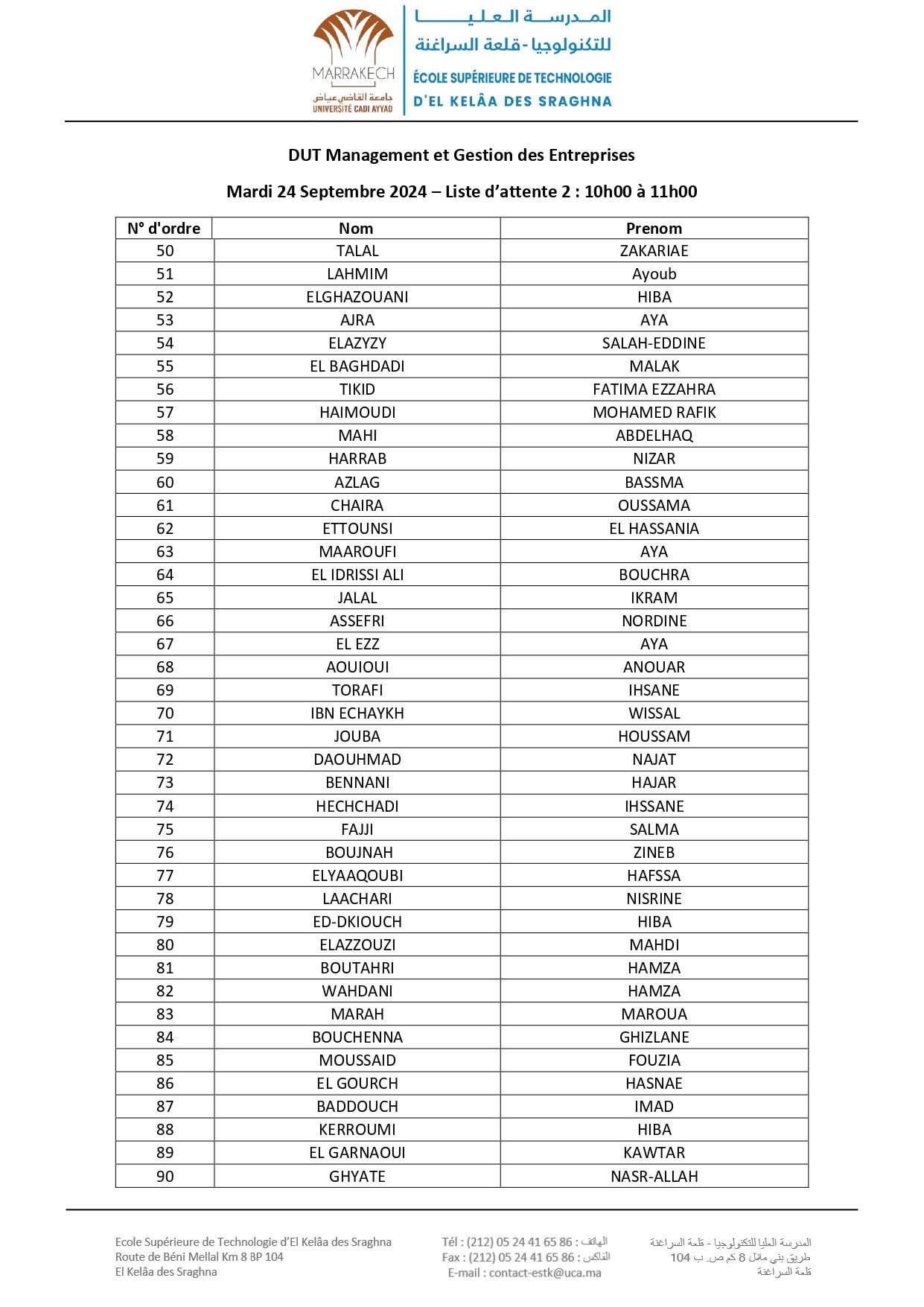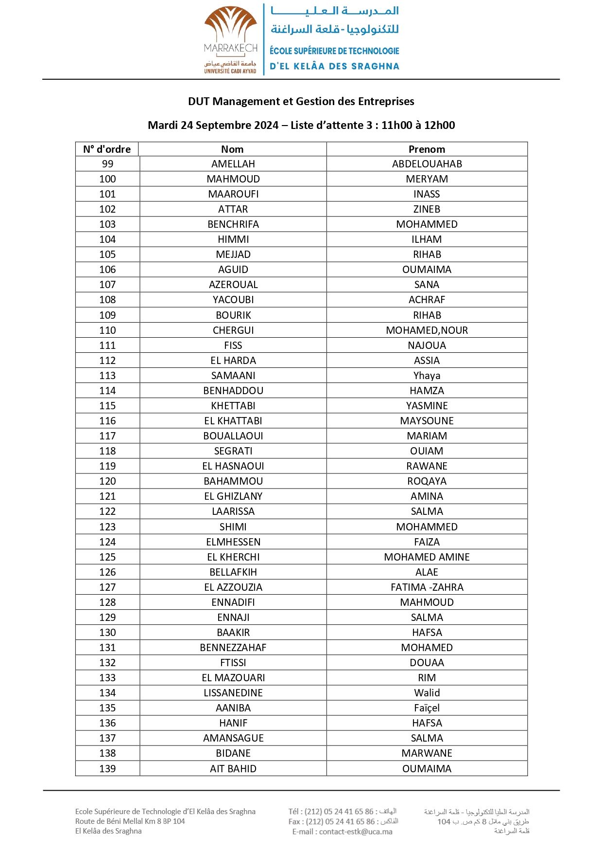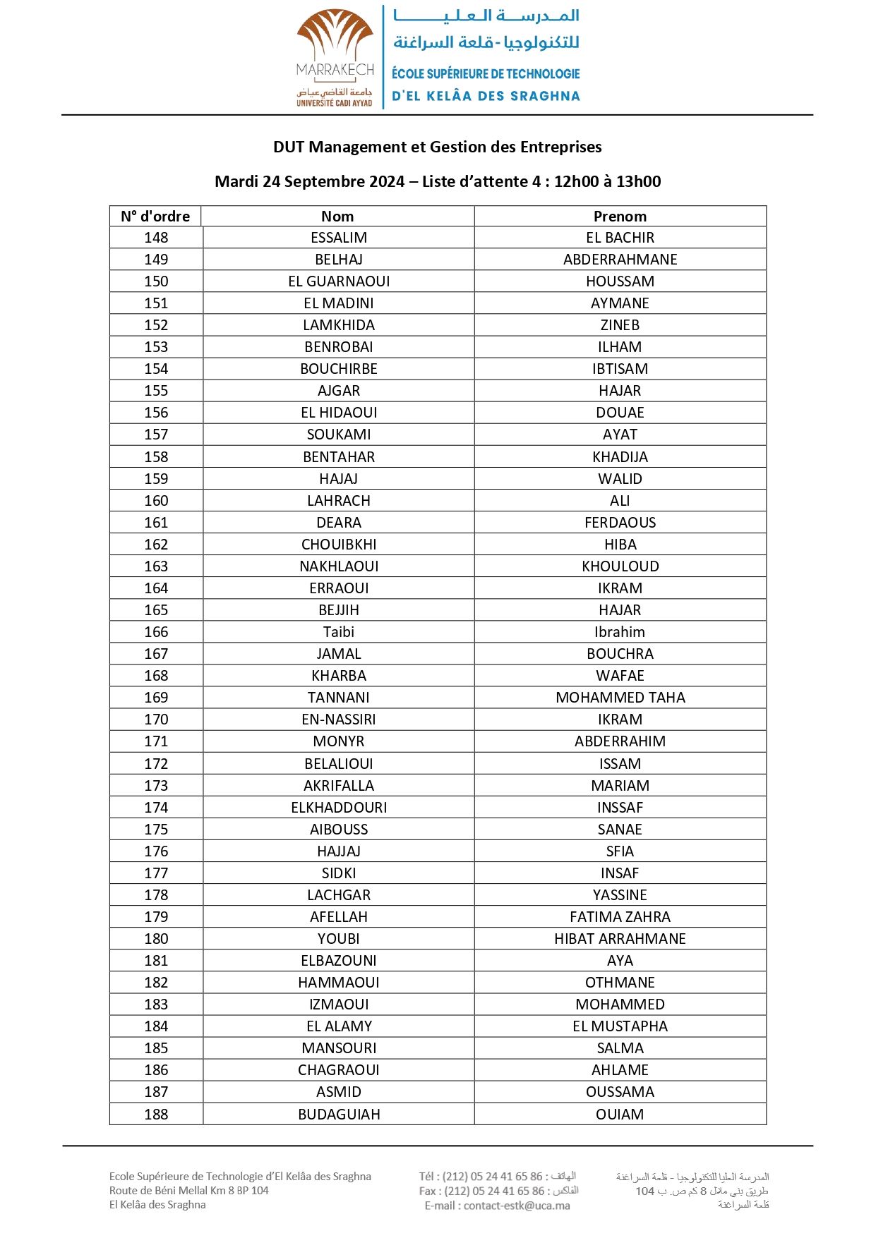 Avis aux nouveaux étudiants admis à s'inscrire en 1 ère DUT à l’EST d’El Kelâa des Sraghna (ESTK) – Listes d’attente : Filière Management et Gestion des Entreprises23 Sept 2024