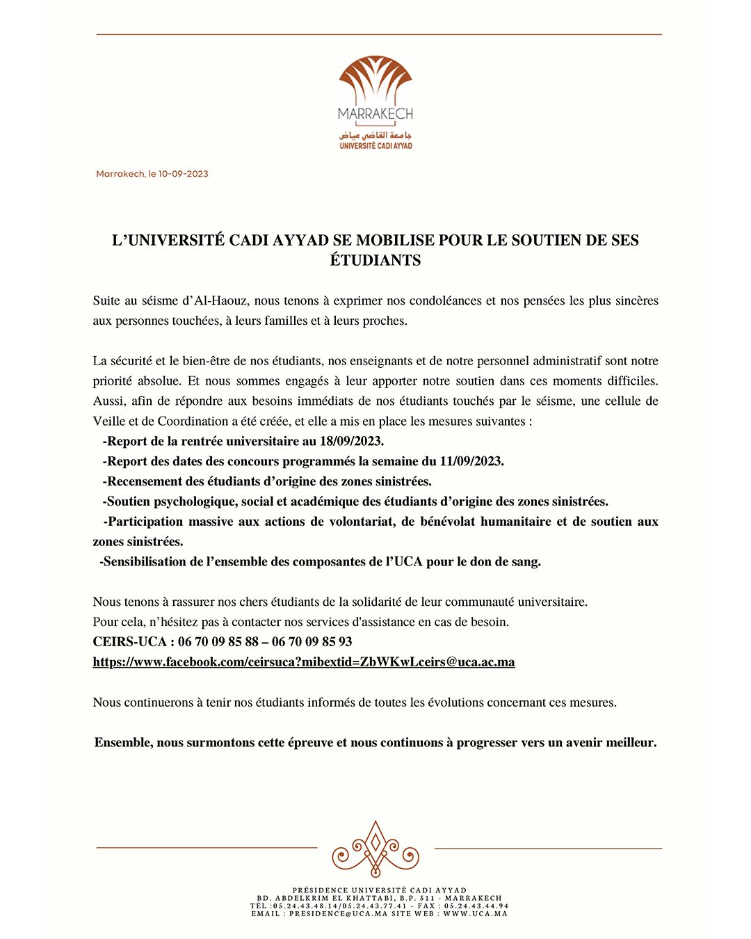 L’Université Cadi Ayyad se mobilise pour le soutien de ses étudiants15 Sept 2023L’Université Cadi Ayyad se mobilise pour le soutien de ses étudiants