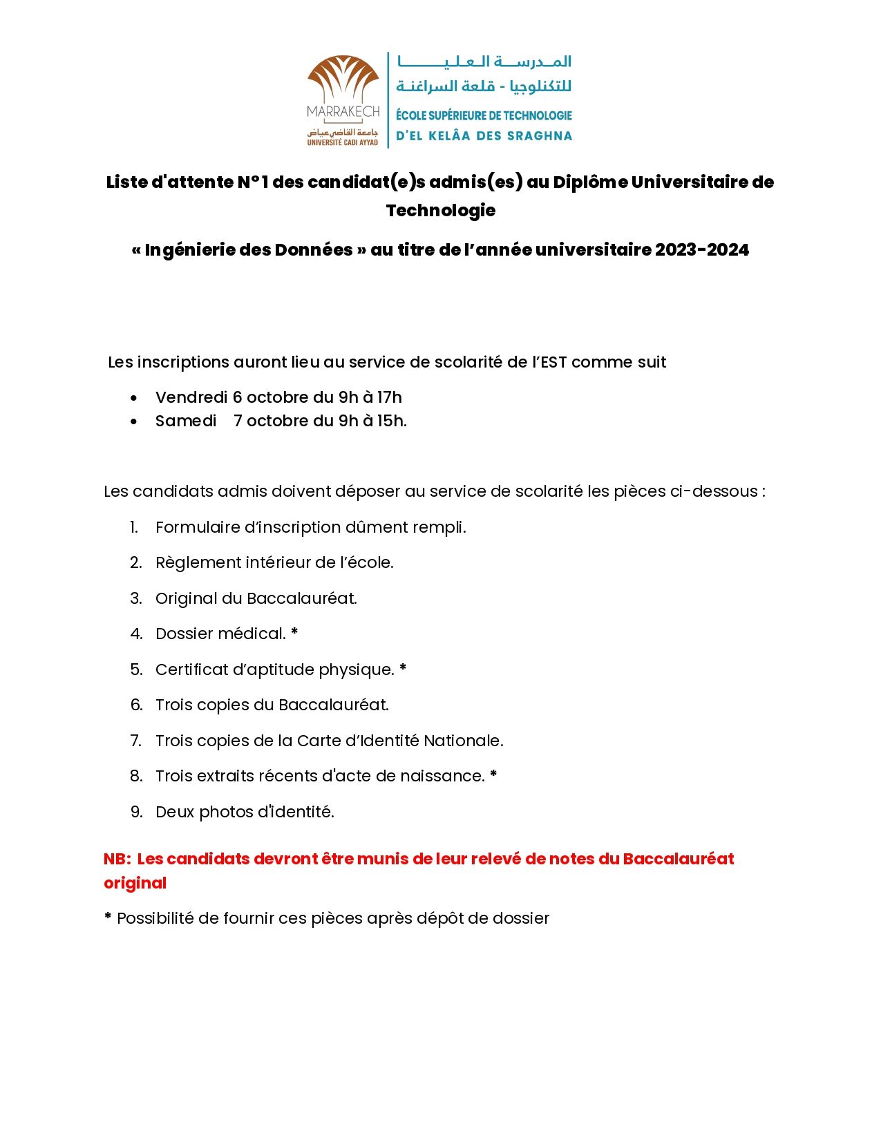 NB: Les candidats devront être munis de leur relevé de notes du Baccalauréat original