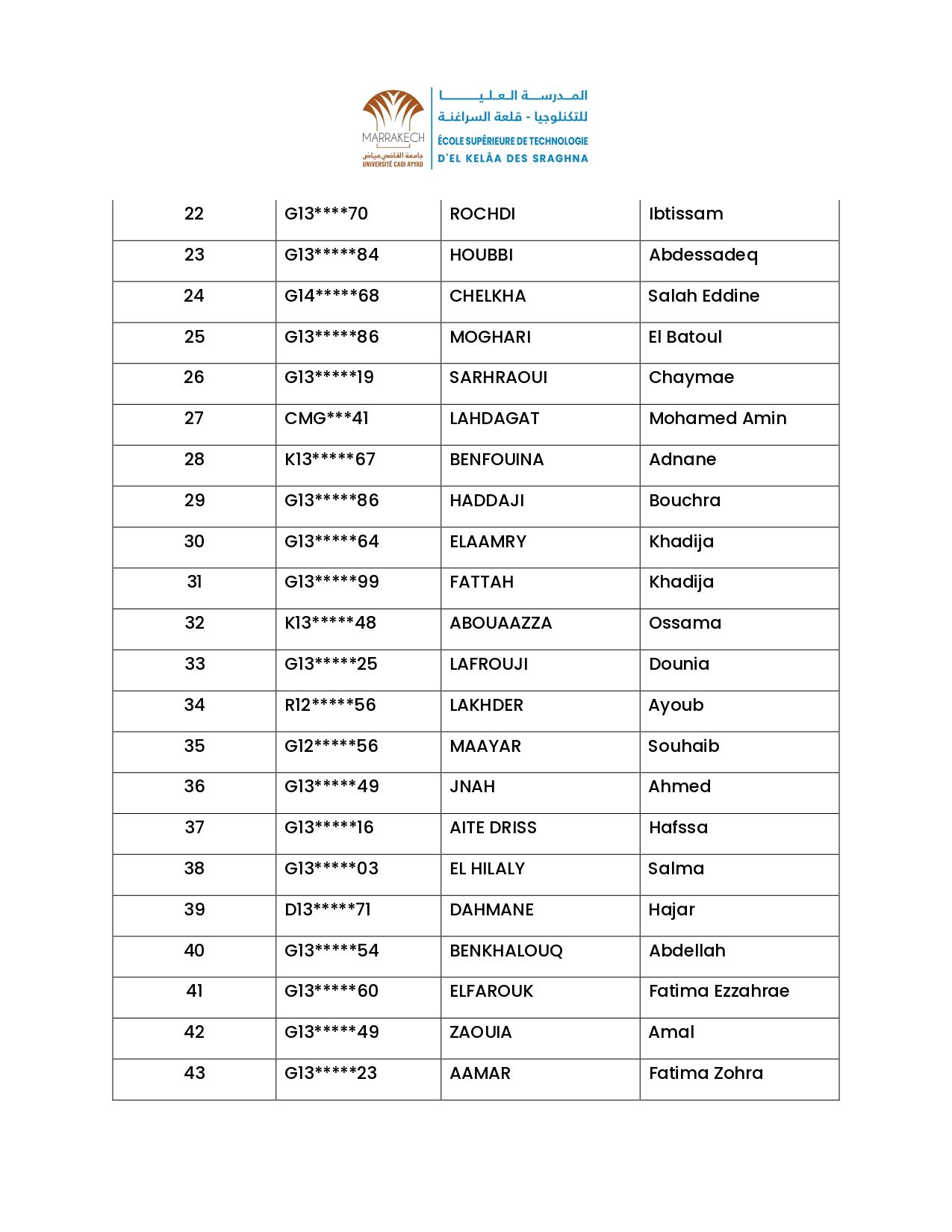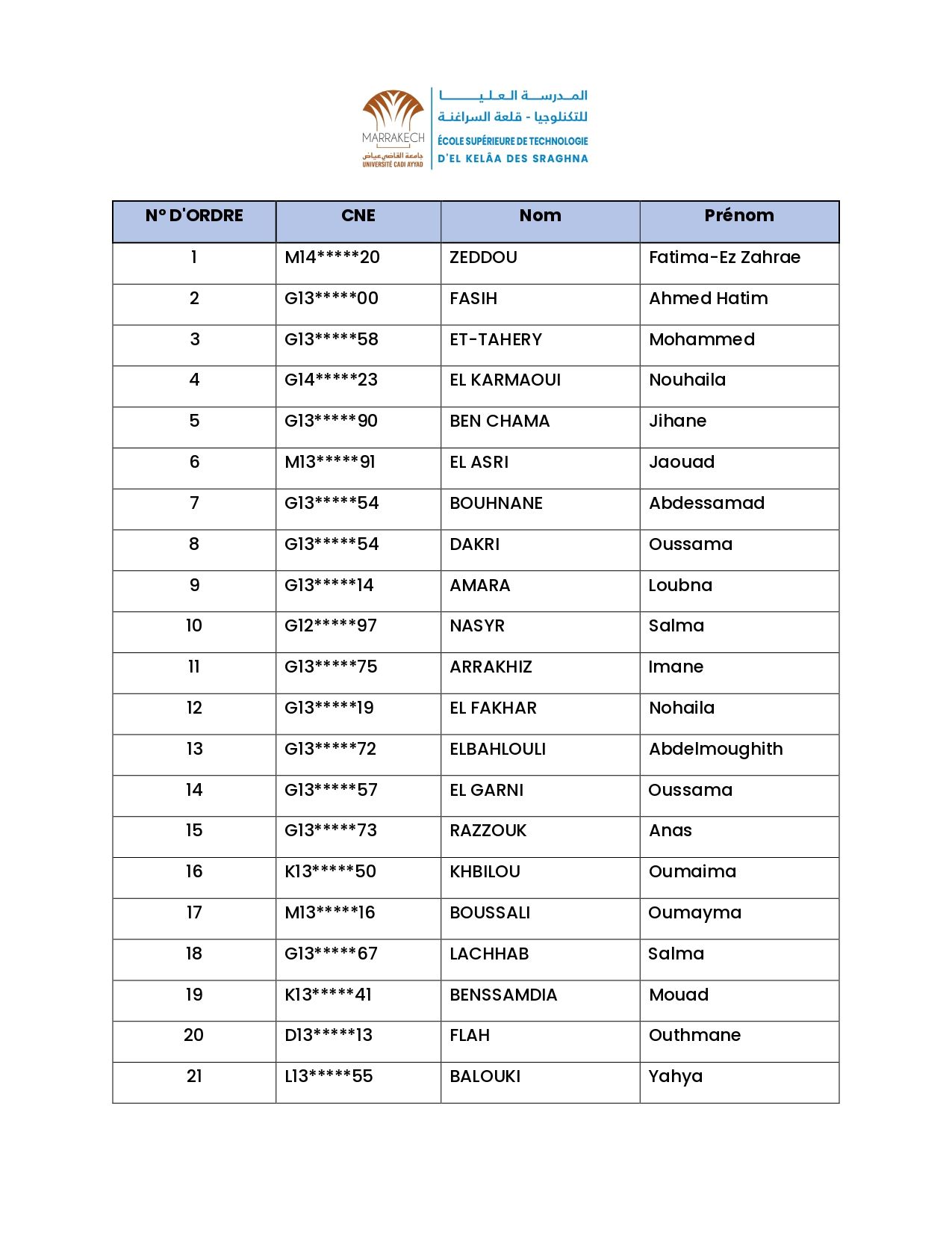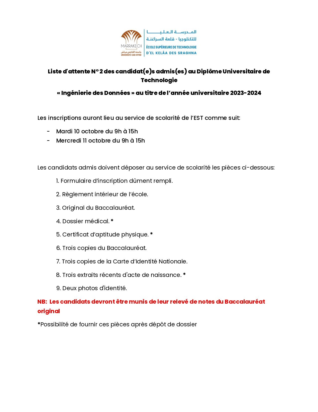 LISTE D'ATTENTE N° 2 DES CANDIDAT(E)S ADMIS(ES) AU DUT "INGÉNIERIE DES DONNÉES" AU TITRE DE L’ANNÉE UNIVERSITAIRE 2023-2024